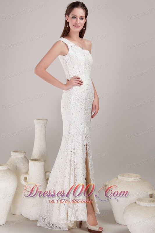 Are you looking for a dream dress for your wedding?This must be the one you can't miss. The white bridal dress is made of delicate lace material and soft silk satin. It features a fashionable and elegant one shoulder neckline. A slit cut from the knee creates both a sense of allure and elegance. Glimmering beading scatters throughout which make the dress sparkling. The bottom of the skirt is composed of soft and clear lines which creates a lovely shape. Zipper up on the left side make the dress easily on and off. A sweep train completes the whole look.