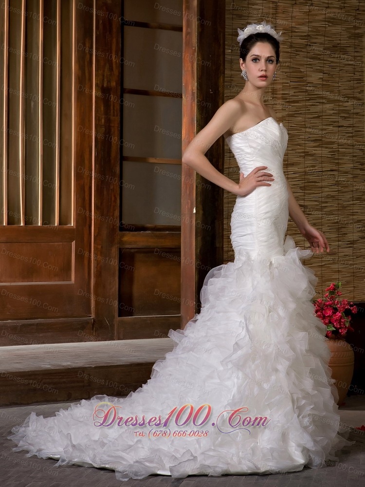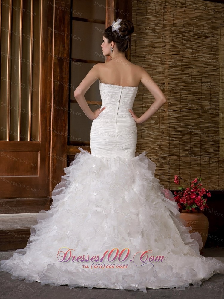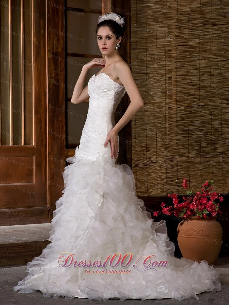 Do you want to be the most gorgeous bride in the world? If so, that dress will be sure to be your best choice. This wedding gown features a sweetheart neckline bodice. The ruchings from the very top to the thigh will contures your figure perfectly. The mermaid-style flares out from the middle of the thigh to the floor, leaving a chapel train. The ruffles on the skirt makes the dress a high-end fashion. The hidden zipper-up back finishes the design. What a pretty dress!