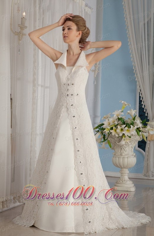 This gown features special lace collar and bodice that is encrusted with crystals and stones on the front. The bottom of the skirt has lovely kace details and a big train. A bit retro and a lot gorgeous! You will look like a queen in the pretty dress.