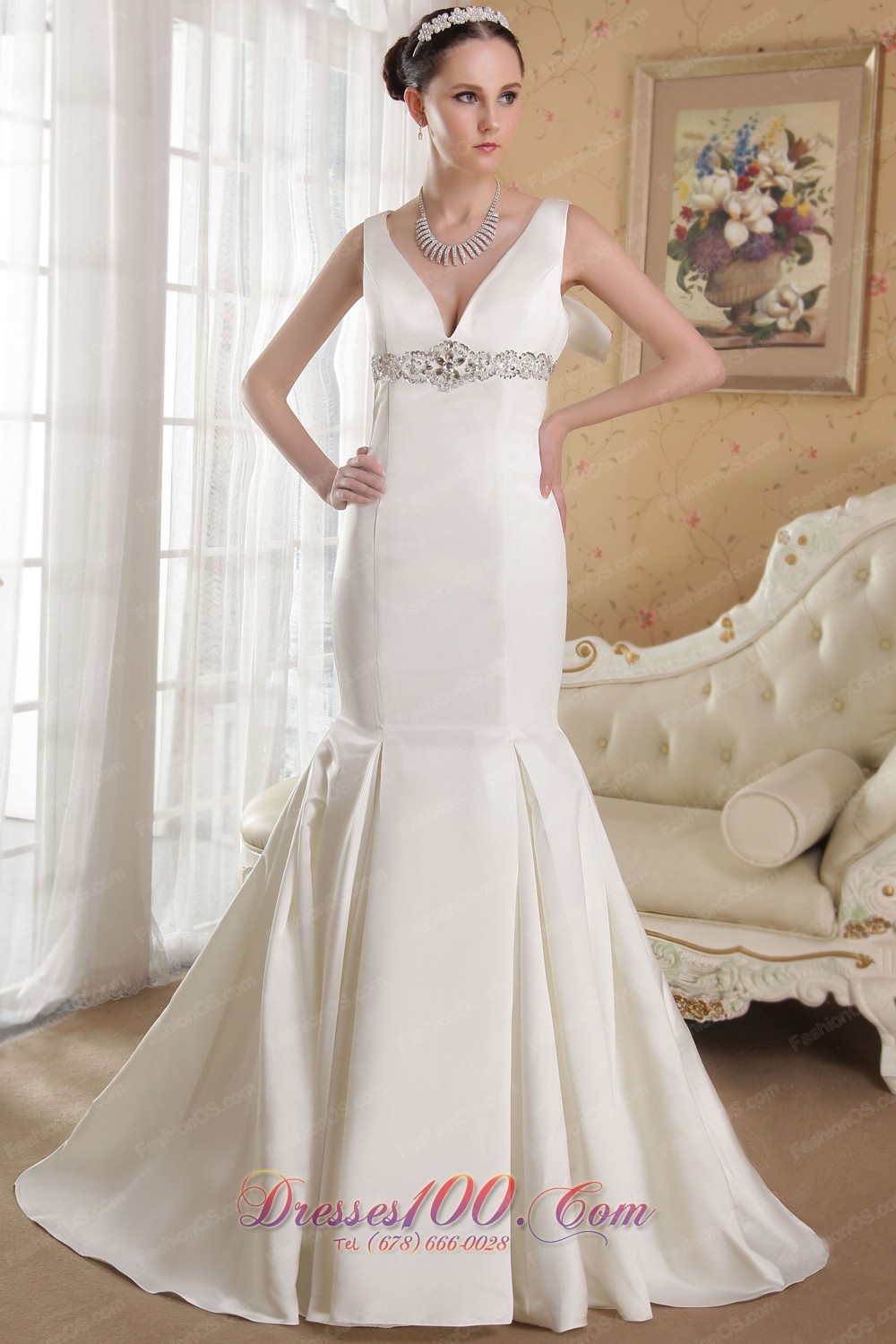 Mermaid V-neck Bridal Dress Gilding Court Train Satin