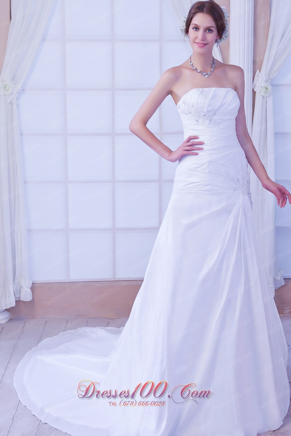 The white strapless wedding dress features a strapless neckline and a bodice that is fully embellished with intricate ruching and shimmering beadings. The style of the dress is simple yet elegant, especially the floral beads on the side of the hipbone area adds interest to the midsection. The floor length A-line skirt flows beautifully with a lovely sweeping train that pools in a pond of fabric. A zipper up style closure encrusted with decorating buttons extending to the very end of the bodice, which makes the dress standout. You can't miss it. Take it home now!