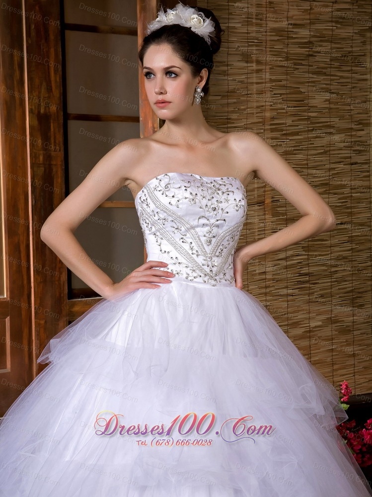 Do you want to rock the presents in your wedding? If so, that dress will be your best choice. The wedding dress features a strapless bodice encrusted by the embroidery and beading throughout. The sharp shape design of the embroidery will definitely flatter your figure. For the skirt, made of tieres of ruffles, adds more romance to the dress. The tulle fabric will make you walk freely. The chapel train gives you a touch of elegance to the dress. A hidden zipper up back finishes the perfect design.