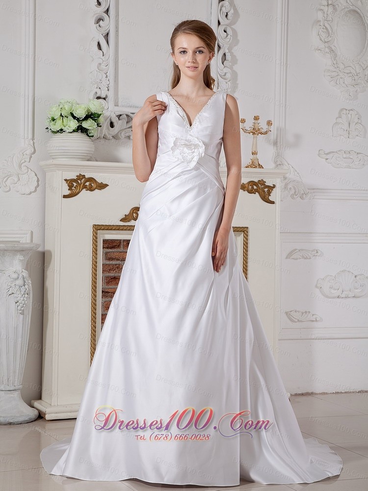 V-neck styles are also the combination of sexy and elegant, this one can be the excellent example. Tops with wide-set straps will also help to visually widen your shoulders and chest area. The close-fitting bodice is well accented with symmetrical ruchings and a dainty flower in the midsection, while the trimming of the straps is also heavily embellished with lovely beadwork. The pleated floor length skirt runs freely to create a perfectly beautiful sweep train. The same V style with another tasteful flower adonrned with beadings on the back complete this fabulous design.