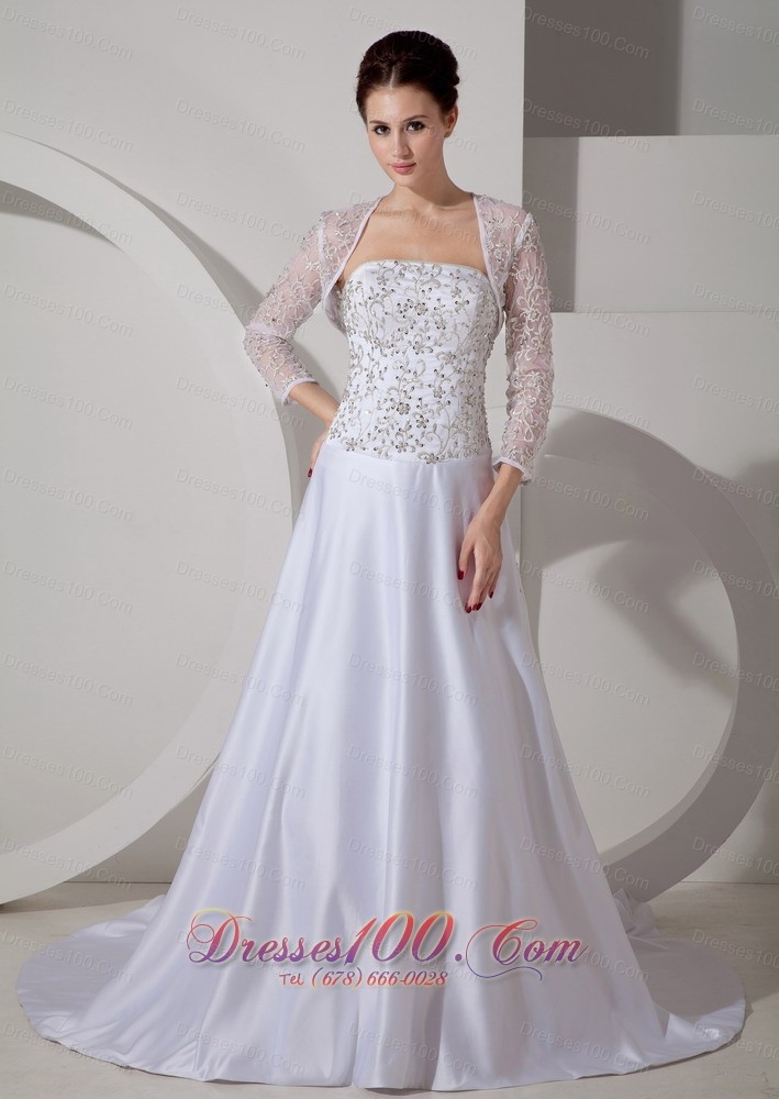 This Bridal wedding dress rivals those seen on the runway. This strapless gown has hundred of thousands of appliques overwhelmed with the entire bodice both front and back and those directly cascading down to the long brush train strikingly! This is a romantic gown that will look good for an indoor or outdoor event. Besides, a nice matching jacket of lace material is for great fit!