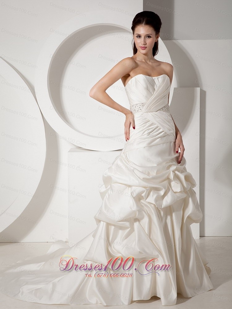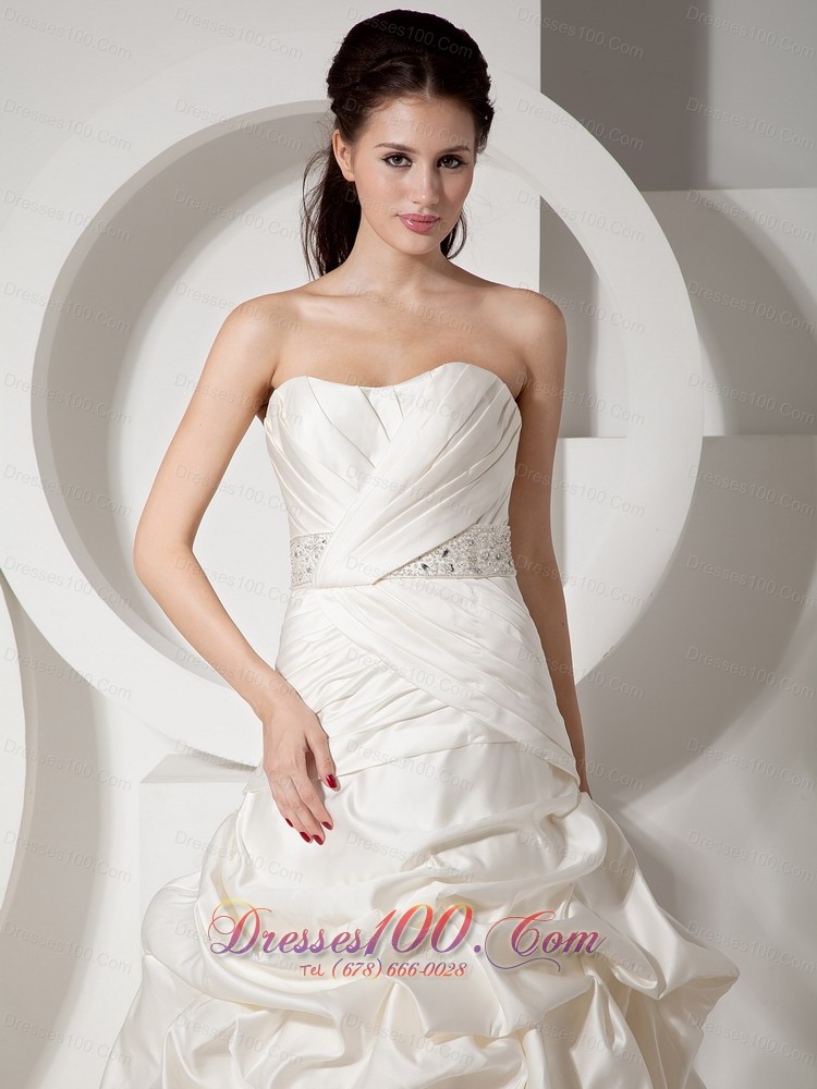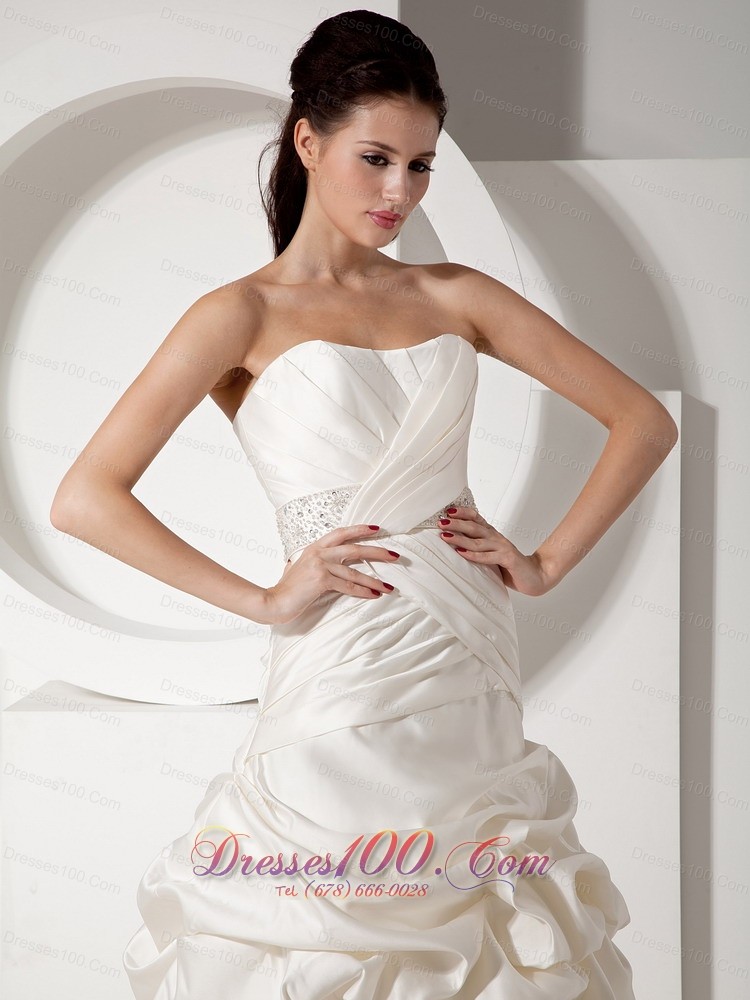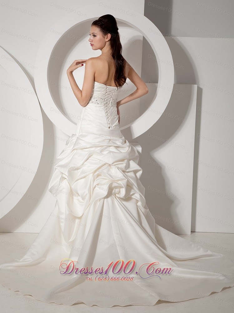 Stylist will perfer the perfect style! It has a slight sweetheart neckline with structed pleating on the corset bodice. Beaded band on the waist shows your figure charming. The pleating continues to the hip. The skirt is covered with delicately designed pick ups to create a bubble-like look. Favorable lace up closure with the long train adds the charm. You will be the focal point on your special day!