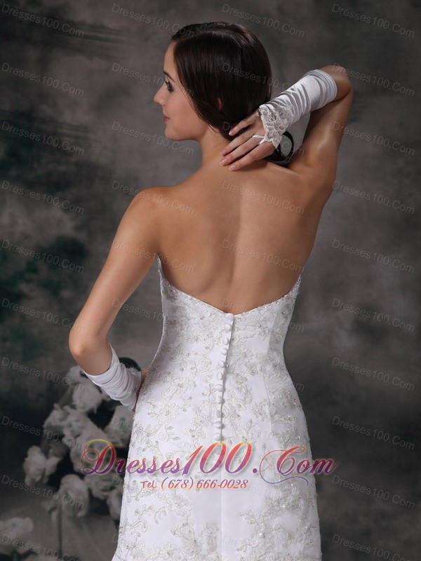 This gown is strapless with a sweetheart neckline and sophisticated lace embroidery encrusts all around the full bust and dropped waist sectioned by light ruchings. The ornate lace details strech to the back with fine covered buttons. The chapel train adds to its unique touch. It's a regal look that is sure to make everyone remember your entrance.
