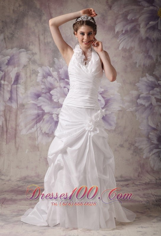 A-line Halter Wedding Gowns Pleated Taffeta Handle Flowers