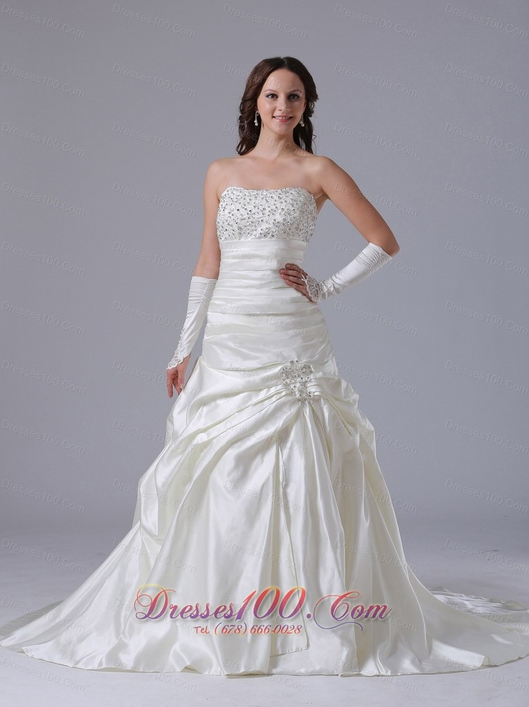 Ivory colored satin fabric is forever the best to make a successful wedding dress. And this elegant wedding dress is styled in the straight neckline decorated with heavy beading which brings a exquisite bustline. With the ruched bodice and the dropped waistline, the dress will show your flawless figure perfectly.The bottom of the dress is closely picked up by two beaded flowers in front and the back.