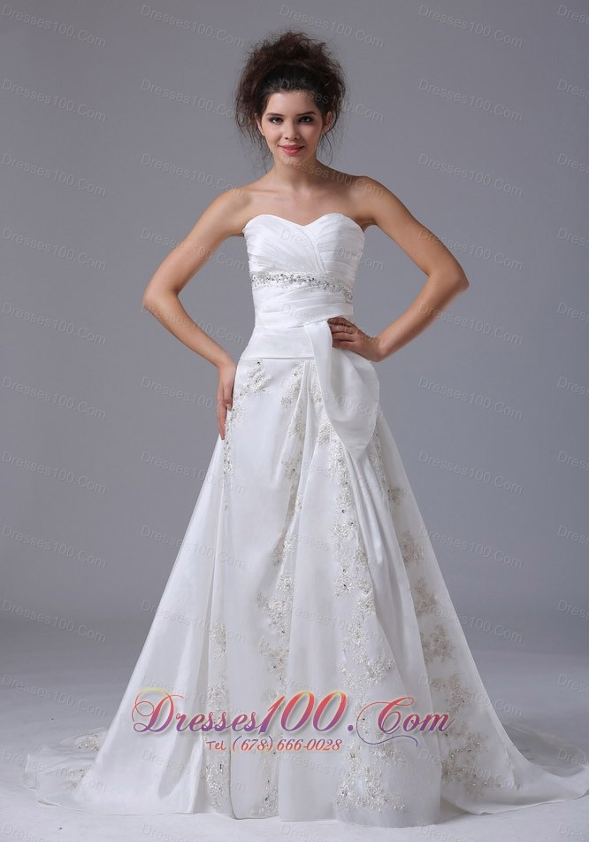 A special day calls for a special dress and this one is sure to suffice. The strapless sweetheart bodice is accented with ruches and flaring beadings. The spaghetti straps add the charm of the dress. The A-line skirt is fabulous and grace, thanks to many appliques beneath that give it its wonderful shape. The zipper in the back of the dress secures it in place and makes for easy off and on. You will have a memorable wedding ceremony.