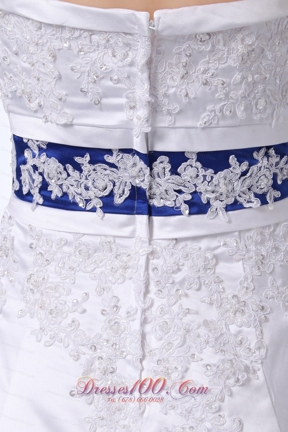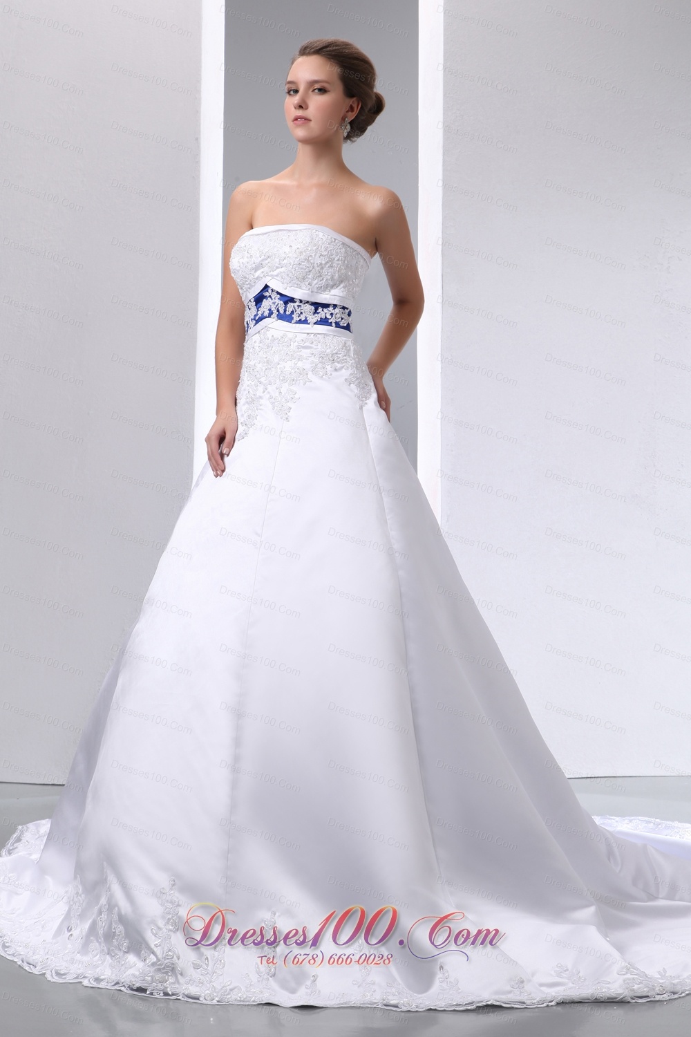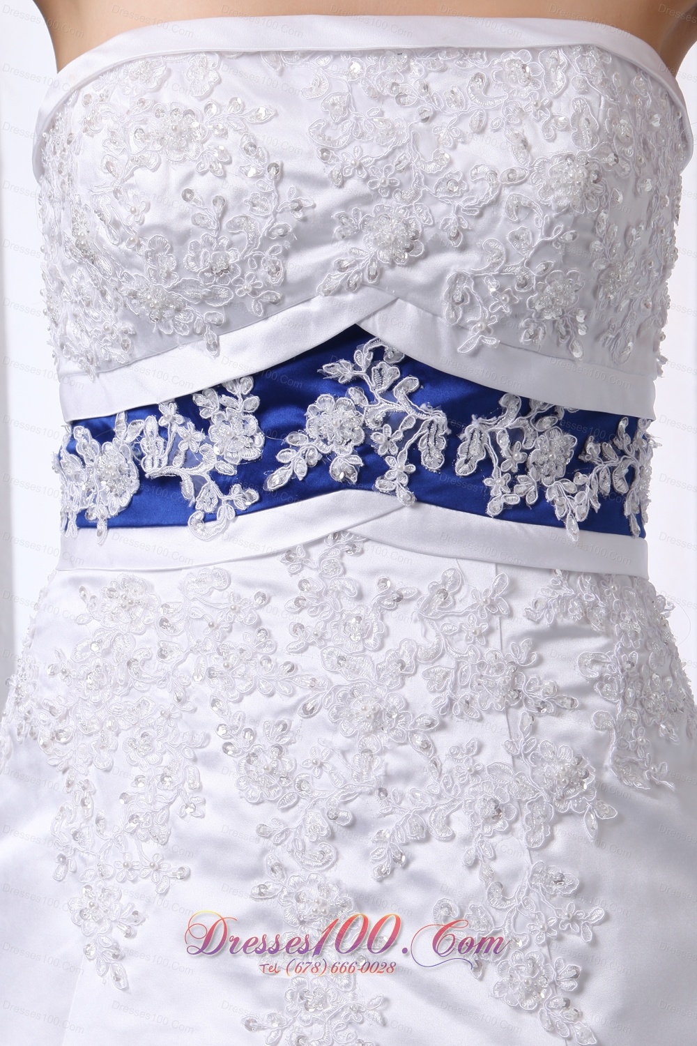 Graceful and sophisticated ! The strapless straigh-cut neckline show just enough skin to be classy without being too revealing. Dazzling and densely scattered lace appliques and beads on the bodice all the way to the back and dress hem make the wedding gown tasteful. Royal blue trim under the bust extending to back creates nobleness. The floor length skirt is full with sparkling accents scattered throughout giving this gown an enchanting style you're sure to love. The dress sways beautifully across the floor when you move, as if you're floating on air.