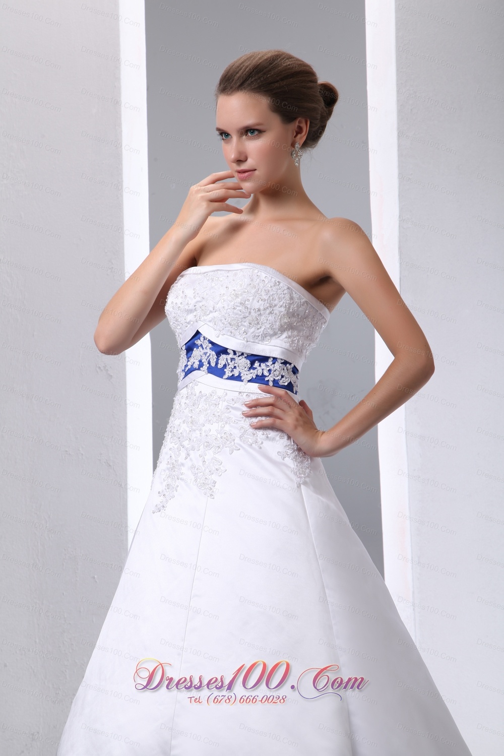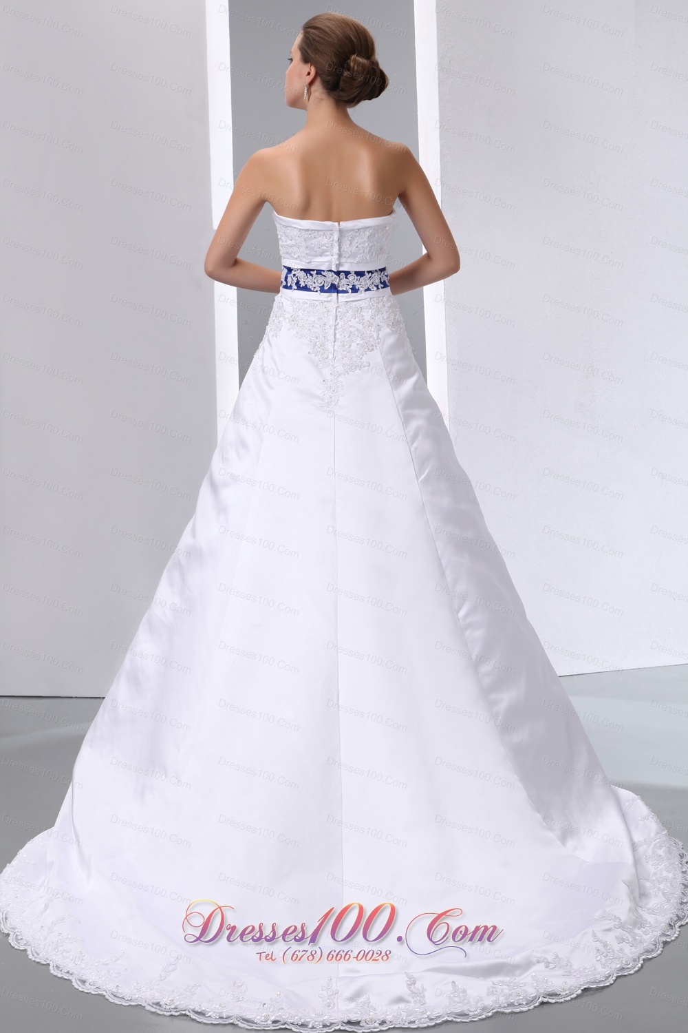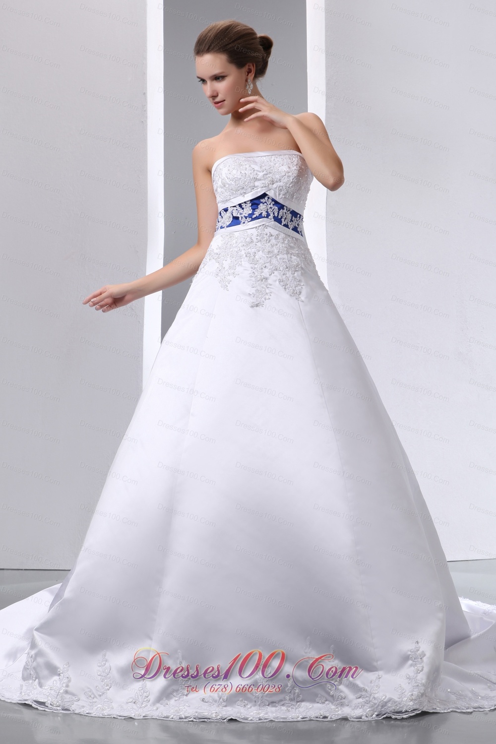 Graceful and sophisticated ! The strapless straigh-cut neckline show just enough skin to be classy without being too revealing. Dazzling and densely scattered lace appliques and beads on the bodice all the way to the back and dress hem make the wedding gown tasteful. Royal blue trim under the bust extending to back creates nobleness. The floor length skirt is full with sparkling accents scattered throughout giving this gown an enchanting style you're sure to love. The dress sways beautifully across the floor when you move, as if you're floating on air.