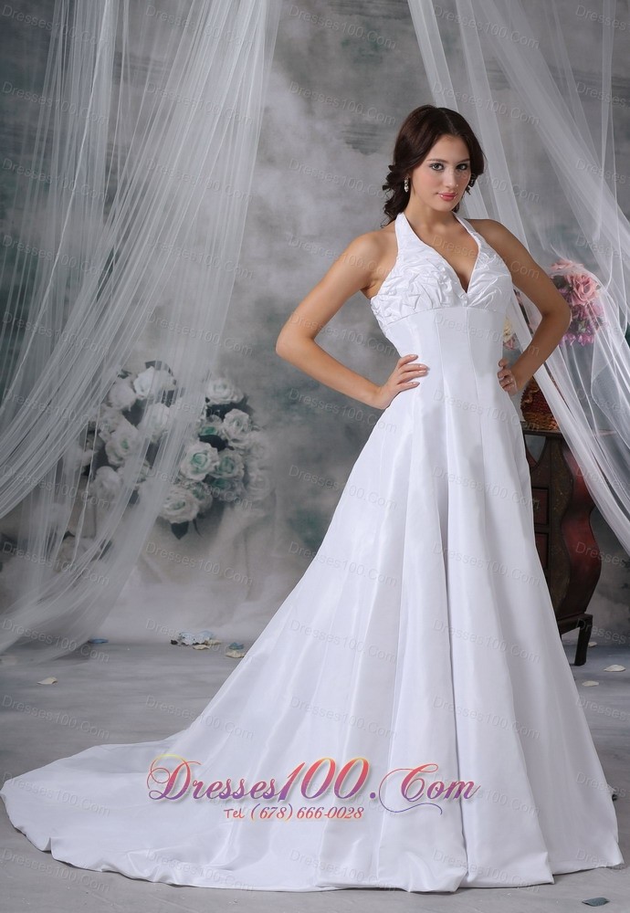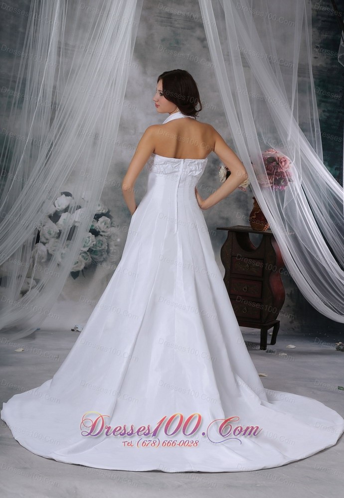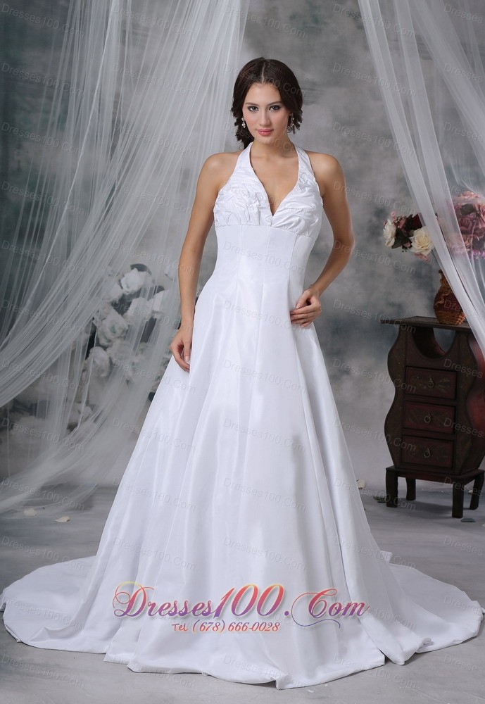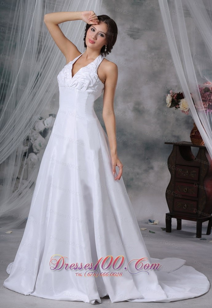 You will be a real surprise in this elegant wedding dress for your husband and other people! The fitted torso dotted with special ruching detail features a halter top forming a V- neckline which beautify the dress. The A-line skirt falls lines to the floor extending a chample train that add more elegance. The zipper up cloaure makes for easy off and on.