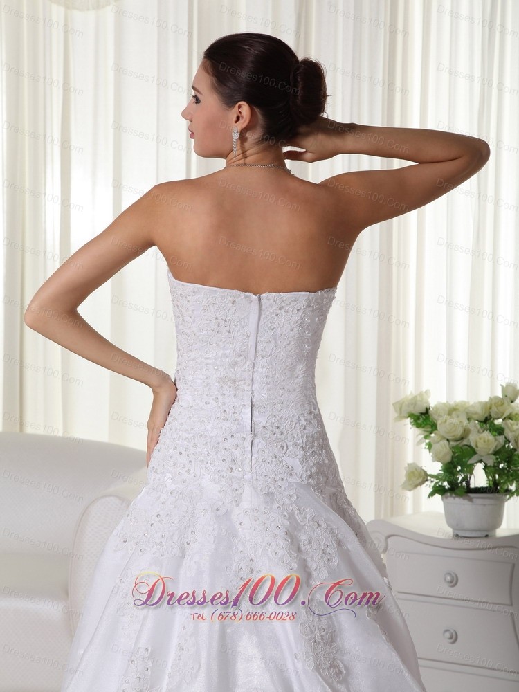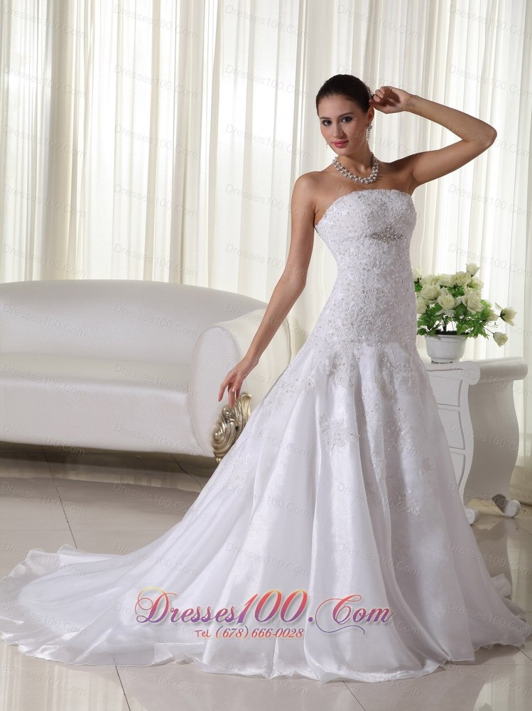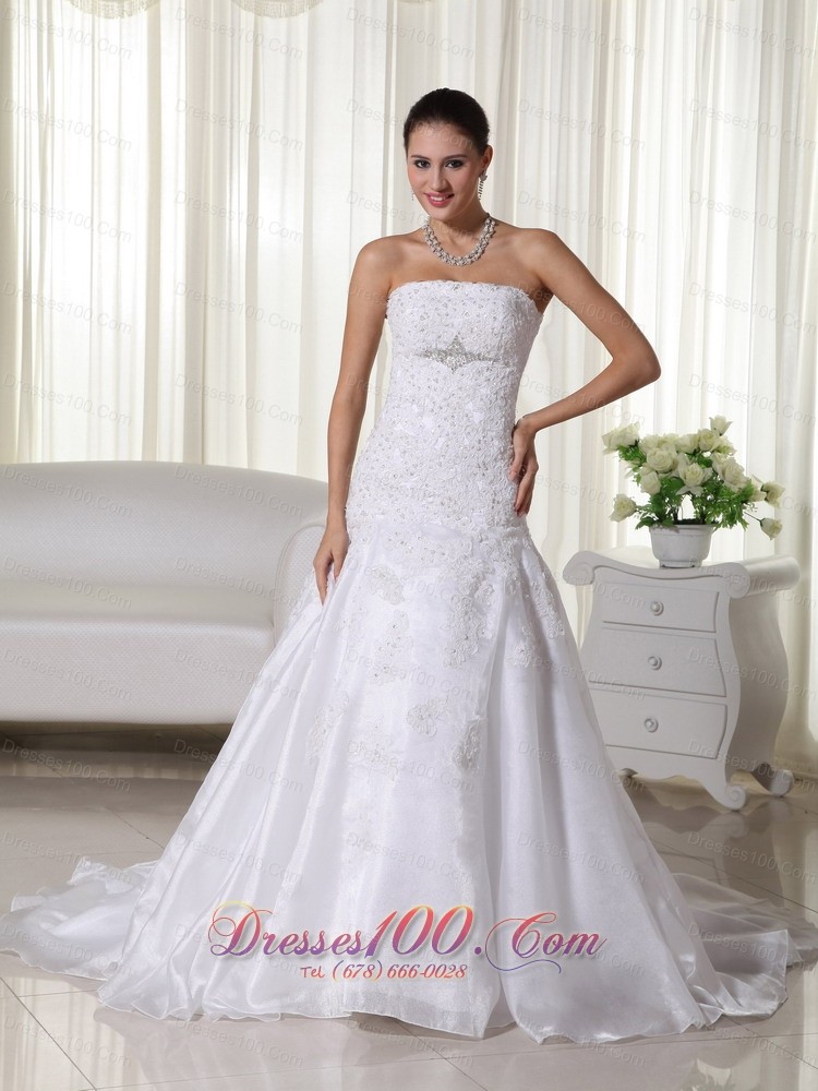 Several unique design features converge to create this stunning Bridals dress. Its strapless neckline also has a wrap-style bodice hugs curves in all the right places. A broach under the bust will conture your curve. The jeweled appliques start at the bust line and stream down to the dropped waistline. A simple yet elegant skirt is down to the floor with a small train.A hidden zipper up back completes the look.