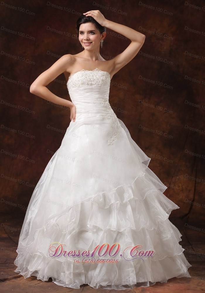You will look like an angle in this gorgeous wedding dress! This strapless dress featrues a fitted bodice with nice lace appliques wraped. The skirt is made of several tiers of ruffled fabric, which gives it a great shape and allows for a beautiful silhouette. A hidden zipper up completes the look. This dress will help you to make your dreams come true! Don't miss it!
