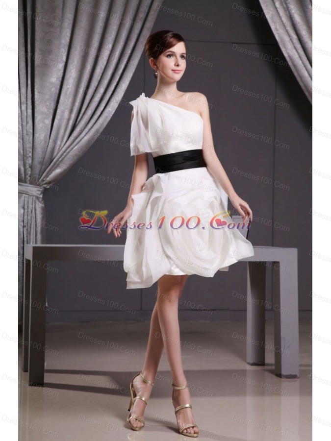 A sexy white prom dress features a one shoulder strap neckline and a contrasting black waistband.The skirt is unique for the 3D flower on the mini skirt. The zipper closure secures the dress in place and ensures easy off and on. A stunning dress for those occasions when you really want to 'wow' the crowd.