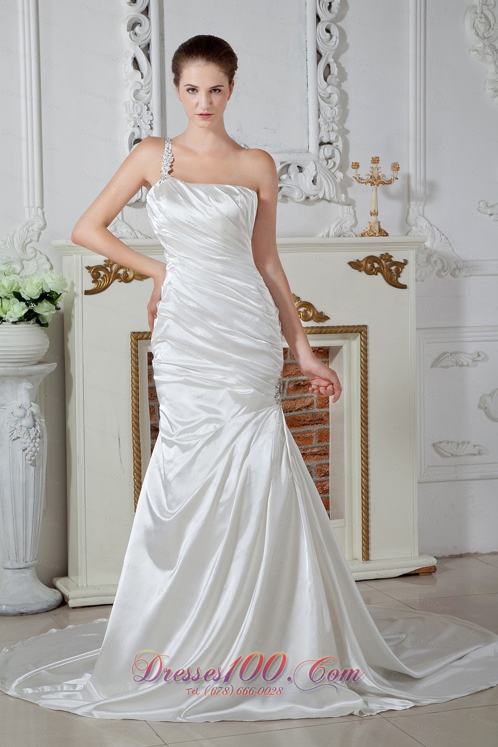 Do you want to show offer your good figure fully? This is a best choice for you. This gown makes your shoulder distinctive with the one shoulder strap accented with floral appliques and crystals. Pleated bodice flatters your slim waistline ideally and a beaded brooch texture starts a mermaid silhouette with a lovely train encrusted with pleats and folds. A lace up tie back finishes the perfect look.