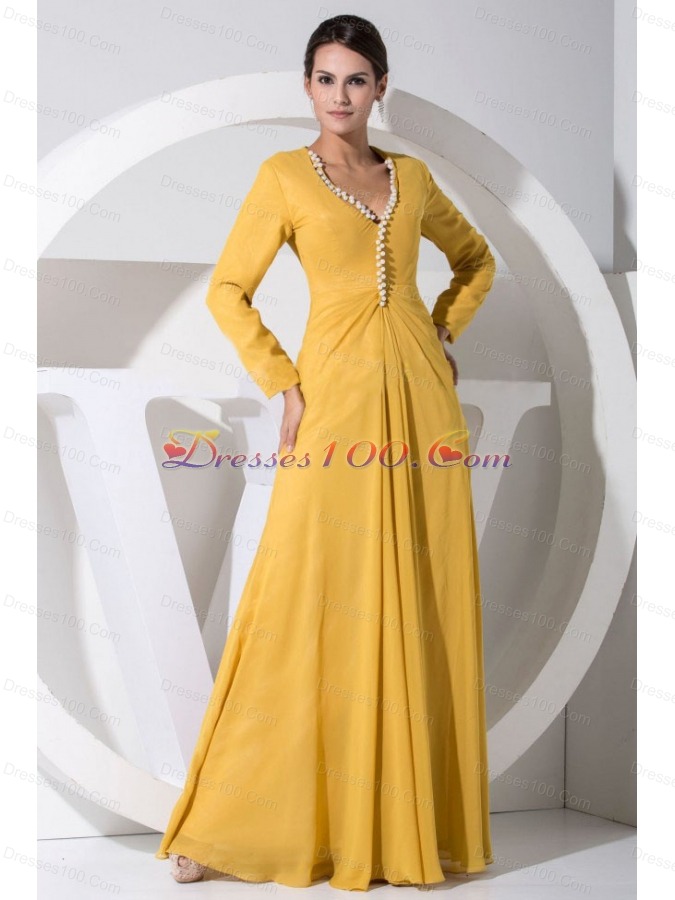 Beading Bodice Gold Long Sleeves Mother Bride Dress