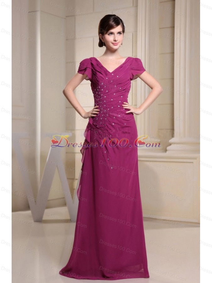 If you're looking for a more traditional style mother of the bride dress for your wedding party, then this one is a great choice. It features pretty short sleeves and a v-neck bodice. The bodice is also beaded and ruched that accentuates your curves beautifully. The floor-length skirt is perfect for comfortable wearing. The zipper up back completes the look. A very classy dress for event or occasion.