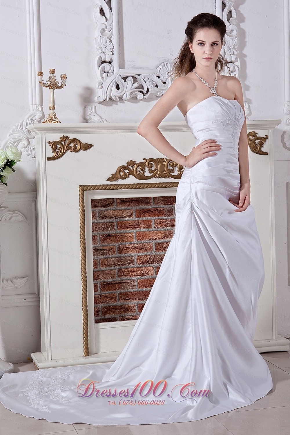 So gorgeous wedding dress includes design of strapless neckline which is generally considered more sexy than other style. You can find that ruchings and appliques decorate the whole bodice which looks charming. Dressing this wedding dress, you will light up your event day. Throughout the full maxi dress, the elegant and poised temperature is displayed entirely. What ?s more, the satin makes you feel soft and smooth. The chapel train design will attract many appreciated eyes. The back of this fabulous design is finished with a lace up back.